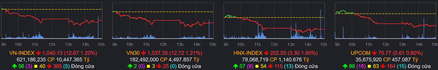 Kết thúc phiên giao dịch, chỉ số VN-Index giảm 12,67 điểm (-1,2%) về 1.040,13 điểm; HNX-Index và UPCOM-Index giảm lần lượt 1,6% và 0,79% xuống 202,55 và 75,77 điểm. Tổng giá trị giao dịch trên 3 sàn đạt 12.035 tỷ đồng - giảm nhẹ khoảng 200 tỷ so với phiên hôm qua nhưng vẫn ở mức cao so với trung bình 10 phiên gần đây.