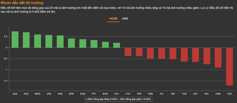 Mặc dù vậy, nhà đầu tư vẫn giữ tâm lý thận trọng khiến thị trường chưa thể bứt phá. Các nhóm ngành lớn như ngân hàng, xây dựng - bất động sản, chứng khoán,... xuất hiện kháng cự khi nhiều mã xanh/đỏ đan xen nhau.