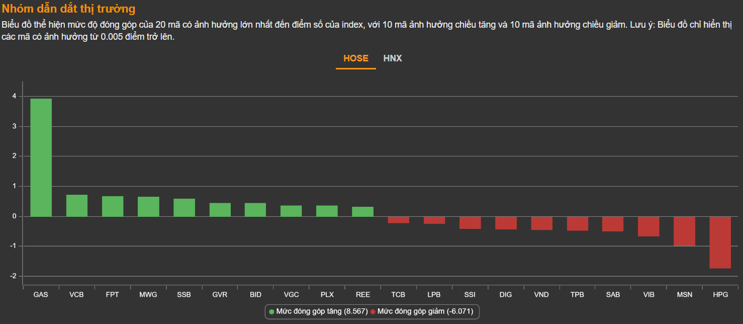 VN30-Index tăng nhẹ 0,31 điểm với 16 mã tăng, 11 mã giảm. Trong đó GAS, VCB và FPT là ba mã đóng góp nhiều điểm nhất cho VN-Index, lần lượt 6,78%, 0,79% và 3,36%.