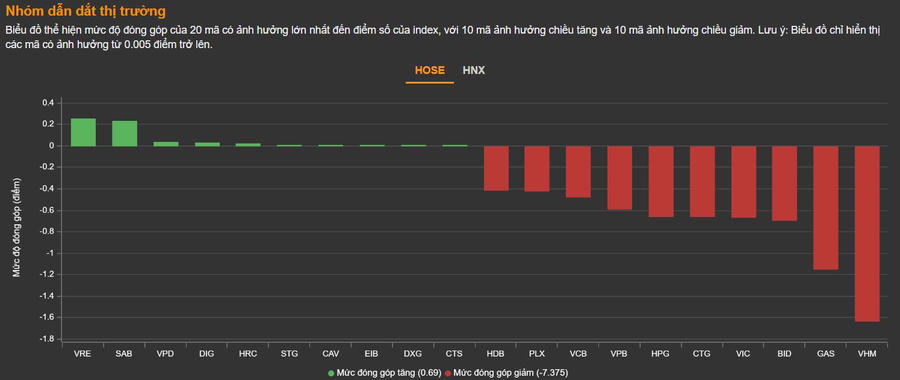 Ở rổ VN30, VRE (+1,6%) và SAB (+0,8%) là hai cái tên duy nhất giữ được sắc xanh nhưng cũng chỉ kéo lại cho chỉ số 0,5 điểm. Ở chiều ngược lại, các mã giảm sâu trên 3% có PLX (-3,5%), HDB (-3,5%), VHM (-3,3%), STB (-3%).