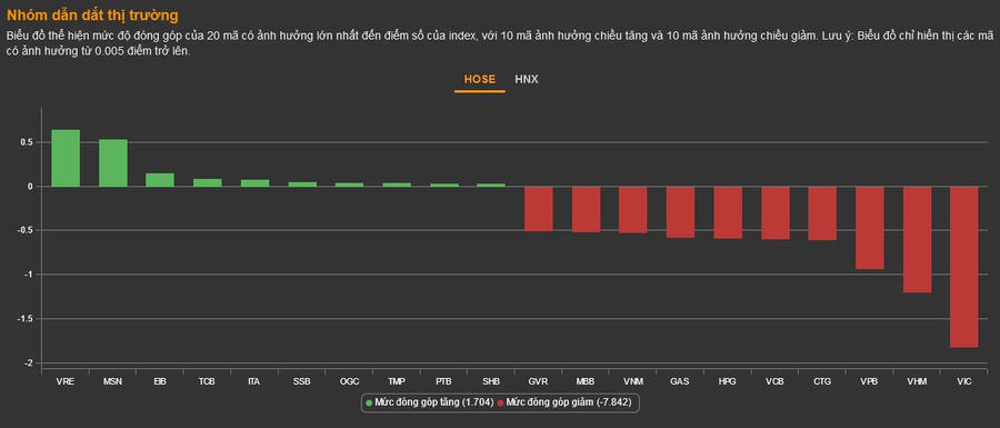 Nhiều mã lọt top đóng góp điểm VN-Index trong phiên sáng nay đảo ngược trong phiên chiều, chẳng hạn như VHM (-2,2%), VCB (-0,6%), HPG (-2%), MBB (-2,4%).