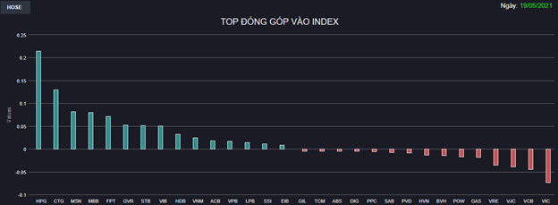 Nỗ lực của HPG dần “lôi kéo” thêm FPT, MSN, VNM và một loạt cổ phiếu ngân hàng như CTG, STB, MBB, TCB, HDB, TPB,... tham chiến giúp đà tăng được củng cố rõ rệt. Ngược lại, một số trụ quan trọng như VIC, VCB, VJC, VRE,... vẫn còn chìm trong sắc đỏ.
