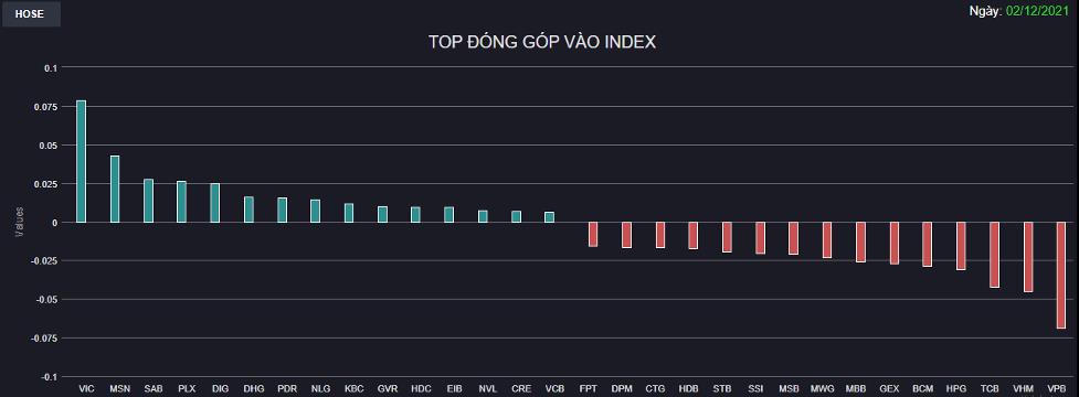 Hai đầu tàu kéo chỉ số là VIC, VCB đều bị thu hẹp đáng kể đà tăng là nguyên nhân chủ yếu khiến thị trường hụt hơi. Nhóm Ngân hàng chịu áp lực bán khá mạnh khiến VPB, TCB, MBB, MSB, STB, HDB đảo chiều giảm đỏ. Nhiều Bluechips như VHM, HPG, MWG, FPT, BVH, REE,... đồng loạt giảm điểm cũng gây thêm áp lực lên chỉ số.