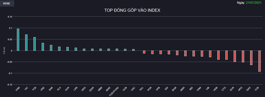 Bộ 3 cổ phiếu “họ” Vingroup gồm VIC, VHM, VRE đóng vai trò kéo điểm nhưng cũng đã bị thu hẹp đáng kể đà tăng. Trong khi đó, các cổ phiếu ngân hàng phân hóa rõ rệt với TCB, LPB, MBB, OCB hồi phục trong khi STB, CTG, VPB, HDB, VCB,.. đều đã chùn bước trước áp lực bán.