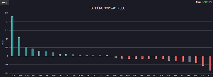 Ở chiều ngược lại, đầu tàu VCB vẫn làm tốt vai trò giữ lửa trong khi nhiều cổ phiếu ngoài nhóm VN30 như GMD, LGC, KDC, HVN, MSB, OCB, IJC, KBC, VND,... cũng thu hút tốt dòng tiền.