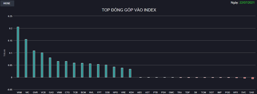 Ngoài ra, các Bluechips hạng nặng như VCB, GAS, VNM, FPT, HPG,... cũng đóng góp không nhỏ vào đà tăng của chỉ số. Trong khi chiều ngược lại không có cái tên nào quá nổi bật ngoại trừ SAB tuy nhiên cổ phiếu này cũng ảnh hưởng không đáng kể.
