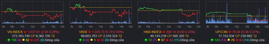 Kết thúc phiên giao dịch, chỉ số VN-Index giảm 2,94 điểm (-0,28%) về 1.037,61 điểm; HNX-Index và UPCOM-Index giảm lần lượt 0,33% và 0,46% còn 206,14 và 76,28 điểm. Tổng giá trị giao dịch trên 3 sàn chỉ đạt 7.113 tỷ đồng - giảm hơn 2.300 tỷ so với phiên hôm qua.