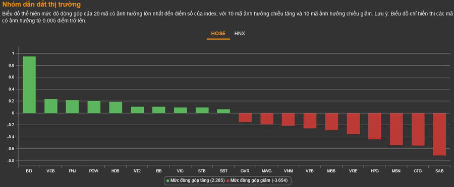 Rổ VN30 hôm nay có tới 20 mã giảm, tuy nhiên trên 1,5% chỉ có các mã VRE, MSN, SAB, SSI và CTG. Ở chiều ngược lại, POW là mã tăng ấn tượng nhất (+2,83%), dẫn đầu thị trường về giá trị giao dịch với 22,7 triệu cổ phiếu được sang tay - trị giá 288 tỷ đồng. Chỉ thua POW về thanh khoản là STB (+0,79%) với khối lượng giao dịch hơn 11 triệu đơn vị, giá trị đạt 283 tỷ đồng.