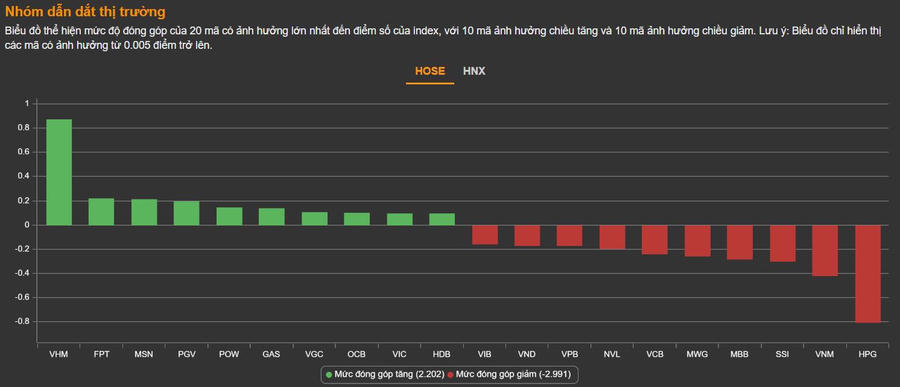 Rổ VN30 có 12 mã tăng trong khi có đến 16 mã giảm. HPG là mã ảnh hưởng tiêu cực nhất đến VN-Index phiên 23/12 (-0,77 điểm). Trong khi đó VHM có phiên tăng tốt thứ 3 liên tiếp, đóng góp cho VN-Index 0,88 điểm.