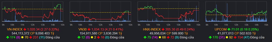 Kết thúc phiên giao dịch, chỉ số VN-Index giảm 2,27 điểm (-0,22%) còn 1.020,34 điểm; HNX-Index giảm 0,24% về 205,30 điểm, chỉ còn UPCOM-Index tăng 0,25% lên 71,01 điểm. Thanh khoản giảm hơn 4.000 tỷ, chỉ đạt 10.189 tỷ đồng.