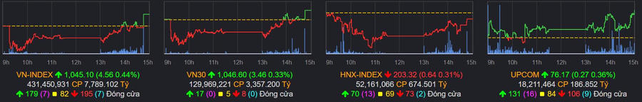 Kết thúc phiên giao dịch, chỉ số VN-Index tăng 4,56 điểm (+0,44%) lên 1.045,10 điểm; HNX-Index giảm 0,31% về 203,32 điểm; UPCOM-Index tăng 0,34% lên 76,17 điểm. Tổng giá trị giao dịch trên 3 sàn đạt 8.644 tỷ đồng - giảm khoảng 1.100 tỷ so với phiên hôm qua.