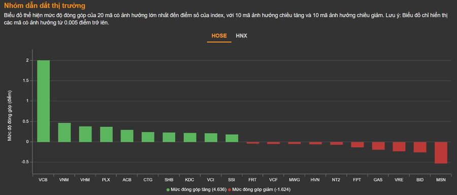 Ở rổ VN30, sắc xanh vẫn chiếm đa số với 17 mã trong khi chỉ 8 mã giảm. SSI (+2,5%) và PLX (+3,3%) là hai mã duy nhất tăng trên 2% trong khi VCB (+1,9%) có công lớn khi đem về cho VN-Index tới 2 điểm.