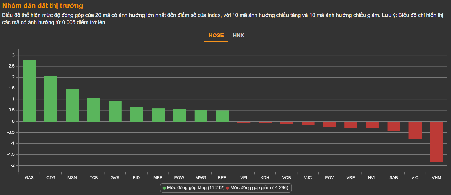 Rổ VN30-Index có 20 mã tăng, chỉ 9 mã giảm. Trong đó top 5 mã đóng góp nhiều điểm nhất cho VN-Index bao gồm GAS (+2,8 điểm), CTG (+2,07 điểm), MSN (+1,49 điểm), TCB (+1,05 điểm) và GVR (+0,94 điểm).