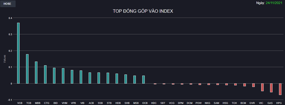 VHM là cổ phiếu duy nhất không ngoài Ngân hàng nằm trong top kéo điểm nhưng không phải dòng tiền chỉ bó hẹp trong nhóm này. Nhiều Bluechips cũng khởi sắc như VNM, FPT, MWG, MSN, VRE, BVH,... càng củng cố đà tăng cho VN-Index.