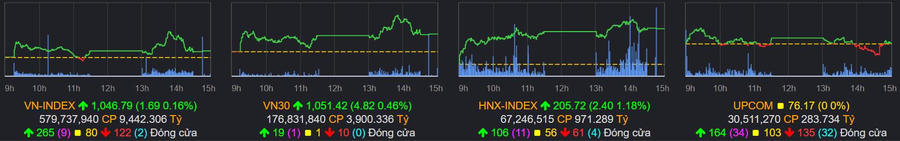 Kết thúc phiên giao dịch, chỉ số VN-Index tăng 1,69 điểm (+0,16%) lên 1.046,79 điểm; HNX-Index tăng 1,18% lên 205,72 điểm; UPCOM-Index giữ nguyên giá tham chiếu 76,17 điểm. Tổng giá trị giao dịch trên 3 sàn đạt 10.691 tỷ đồng - tăng gần 2.000 tỷ so với phiên 23/3.