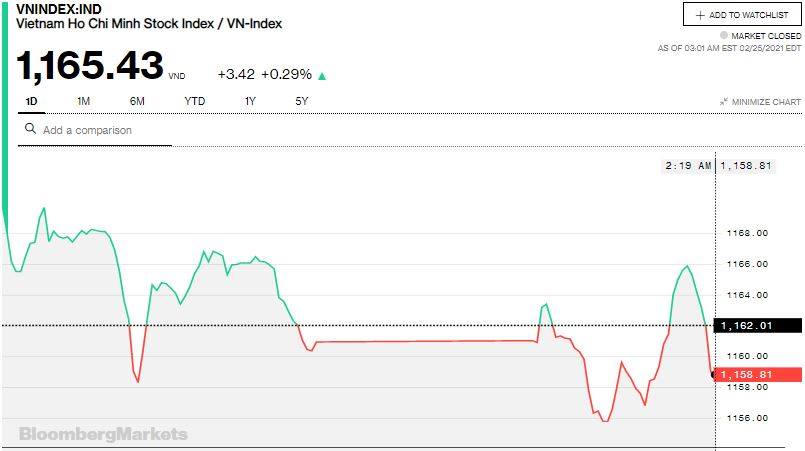 Thị trường ngày 25/2 diễn ra trong bối cảnh chứng khoán Mỹ quay đầu lập kỷ lục mới. Dow Jones tăng 424,51 điểm (tương đương 1,4%) lên mức đóng cửa cao kỷ lục 31,961.86 điểm, nhờ nhóm cổ phiếu năng lượng, công nghiệp và tài chính. Chỉ số Nasdaq Composite (chỉ số giá cổ phiếu của các công ty được niêm yết trên sàn giao dịch chứng khoán Nasdaq) tăng 1% và S&P tăng 1,14%.