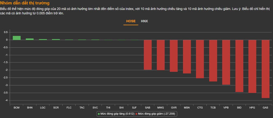 Rổ VN30-Index là nguyên nhân chính khiến VN-Index mất hơn 33 điểm. Toàn rổ không có mã nào tăng giá, trong khi có tới 29 mã giảm và chỉ 1 mã tham chiếu là VRE.