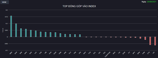 Các Bluechips như MSN, GVR, SAB, HPG, GAS, VJC, VCB,... đã trở lại đúng lúc để dẫn dắt VN-Index vượt qua khó khăn. Chiều ngược lại, VIC và CTG là 2 cái tên ảnh hưởng tiêu cực nhất lên chỉ số.