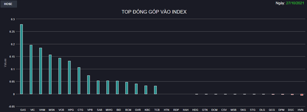 Sắc xanh bảo phủ hầu hết các nhóm cổ phiếu với 355 mã tăng điểm trên HoSE, áp đảo so với 95 mã giảm và 42 mã đứng giá. Trong đó, một loạt Bluechips như GAS, VIC, VHM, MSN, HPG, SAB, MWG, VCB, CTG, VPB, TCB,... có công rất lớn. Thống kê cho thấy, 15 cổ phiếu đóng góp lớn nhất mang lại cho VN-Index đến 22 điểm.
