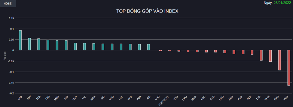 Nhiều Bluechips như VIC, VRE, VJC, MSN, MWG, REE,... khởi sắc, đặc biệt là FPT tăng đến hơn 4% đã đóng góp không nhỏ vào VN-Index. Ngược lại, VHM lại gây thất vọng khi mất điểm dù lãi lớn quý IV và trở thành quán quân lợi nhuận trên sàn năm 2021.