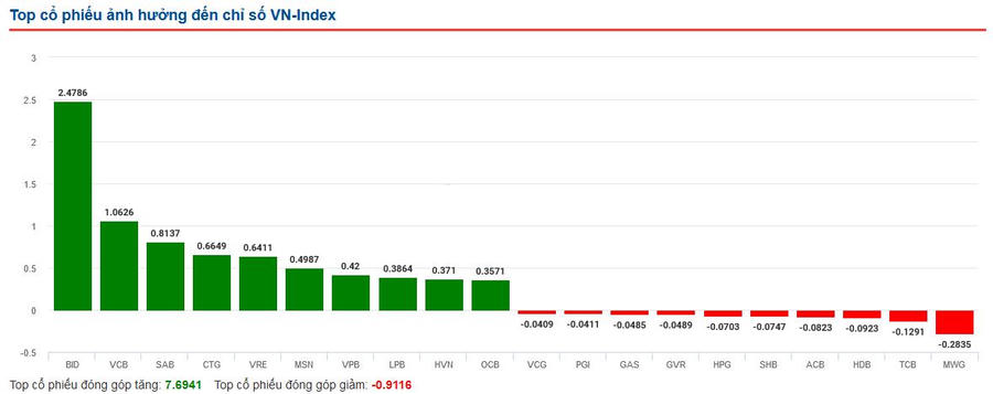 Mã nổi bật nhất phiên là "anh cả" nhóm ngân hàng VCB khi mang về cho VN-Index 2,9 điểm, bỏ xa các mã còn lại trong top 10 đóng góp điểm nhiều nhất cho VN-Index như HVN (+0,43 điểm), PLX (+0,39 điểm), VHM (+0,38 điểm), VNM (+0,31 điểm), EIB (+0,25 điểm),...