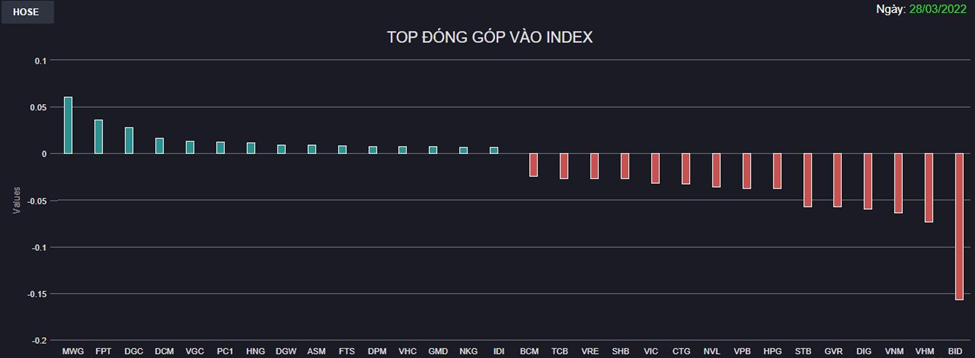 Chiều ngược lại, nhóm thủy sản lại giao dịch đầy hứng khởi với IDI, ACL, CMX, FMC tăng trần trong khi VHC, MPC, AAM,... cũng đều tăng mạnh. Một số cổ phiếu Bán lẻ, Phân bón, Hóa chất cũng giao dịch khởi sắc giúp thị trường bớt ảm đạm. MWG, FPT, DGC,... nỗ lực kéo điểm nhưng không đủ cân lại ảnh hưởng.