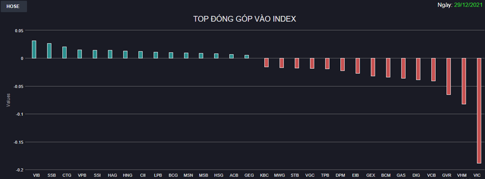 Hàng loạt cổ phiếu vốn hóa lớn quay đầu điều chỉnh trong đó các trụ hạng nặng như VIC, VHM, GVR, VCB đều gây áp lực lên chỉ số. Chiều ngược lại chỉ còn lại một vài cái tên đáng chú ý trong nhóm cổ phiếu tài chính như VIB, SSB, CTG, VPB, SSI khởi sắc tuy nhiên lực kéo không đủ cân lại ảnh hưởng.