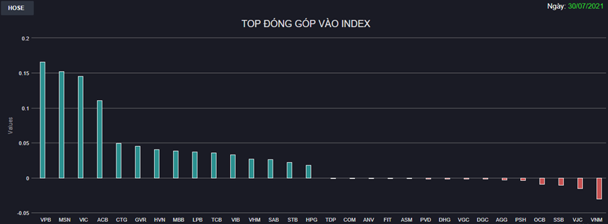 Độ rộng của thị thường được thể hiện qua diễn biến khởi sắc trên một loạt nhóm ngành quanh trọng như ngân hàng, bán lẻ, bất động sản, tài chính, dầu khí,... Nhóm vốn hóa lớn cũng làm tốt vai trò kéo điểm với VPB, MSN, VIC, ACB, CTG, GVR, HVN, MBB, TCB,... Trong nhóm VN30 chỉ còn VJC, VNM giảm điểm và NVL đứng giá.