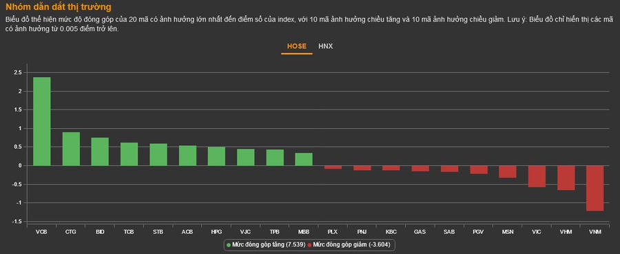 Tin tức nhiều ngân hàng báo cáo kết quả kinh doanh quý IV/2022 lãi hàng nghìn tỷ đưa cổ phiếu nhóm này khởi sắc. Top 10 mã đóng góp nhiều điểm nhất cho VN-Index được thống trị bởi các mã bluechip ngân hàng như VCB (+2,2%), CTG (+2,5%), BID (+1,3%), TCB (+2,4%), STB (+4,8%), ACB (+2,6%), TPB (+4,6%), MBB (+1,6%).