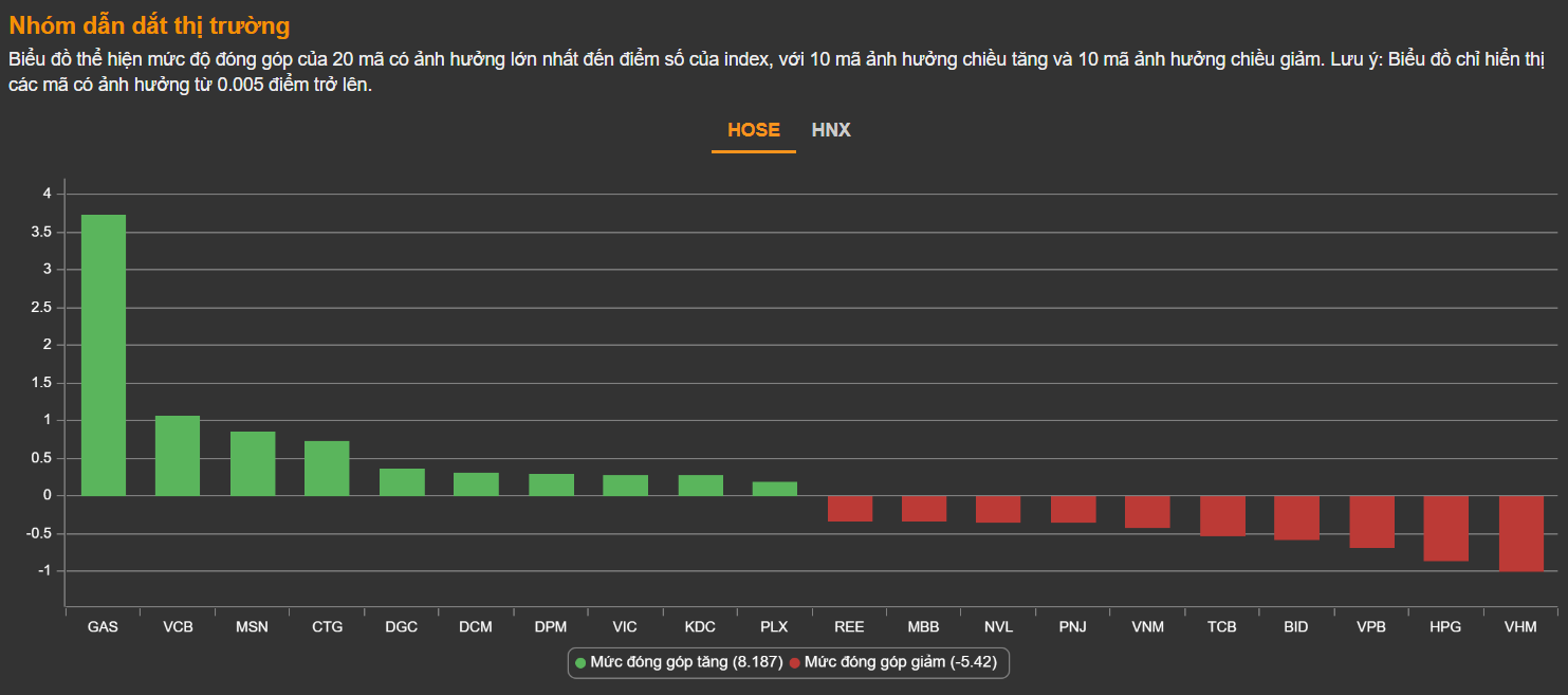 Cổ phiếu dầu khí là ngôi sao trên thị trường với hàng loạt mã tăng ổn định như GAS, PVS, PVD, PVC, PVD,... Trong đó chỉ riêng GAS đã đóng góp 3,64 điểm tăng cho VN-Index.
