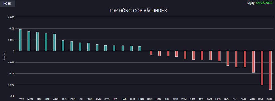 Nỗ lực từ MSN, VRE trong phiên chiều đã bị phủ nhận bởi ảnh hưởng từ GAS, SAB, VJC, PLX,... Nhóm Dầu khí (BSR, OIL, PVD, PVS, PVT, PVB, PVC,...) cũng chịu áp lực chốt lời mạnh sau nhịp tăng nóng cùng giá dầu. Trong khi đó, nhiều cổ phiếu Bất động sản (DIG, DPG, HDC, PDR,...), Xây dựng (HBC, CTD, HTN, FCN, PC1) vẫn khởi sắc.