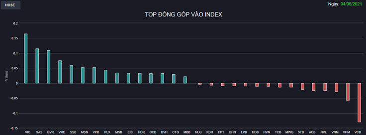 Bên cạnh bộ đôi GAS, PLX, một số Bluechips hạng nặng như VIC, GVR, VRE, MSN,...cũng khởi sắc đóng góp lớn vào đà tăng của chỉ số. Ở chiều ngược lại, VCB, VHM, VNM giảm sâu nhưng không đủ níu chân thị trường. VN-Index đóng cửa cao nhất lịch sử tại 1.374,05 điểm, tăng 9,77 điểm (+0,72%) với số mã tăng giảm không quá chênh lệch.
