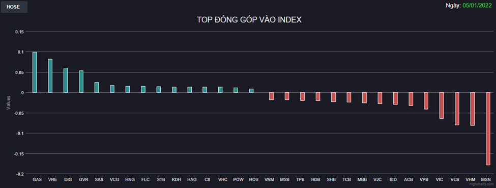 VN-Index quay đầu trong phiên chiều khi sắc đỏ dần chiếm ưu thế trở lại trên nhiều cổ phiếu vốn hóa lớn. MSN là cái tên đáng chú ý nhất khi bất ngờ giảm hơn 5% chỉ với thanh khoản rất thấp, ảnh hưởng đáng kể đến chỉ số. VHM, VIC, VJC và loạt Ngân hàng như VCB, VPB, ACB, BID, MBB, TCB, SHB, HDB,... hầu hết đều đóng cửa thấp nhất phiên khiến thị trường thiếu trụ đỡ.