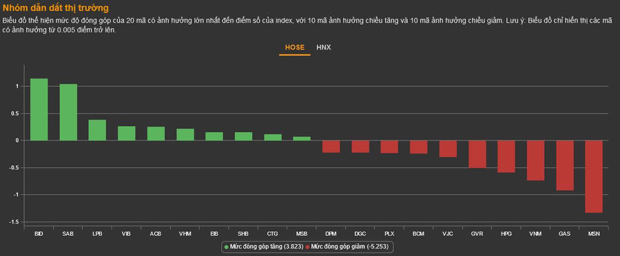 Các mã giảm chiếm đa số ở nhóm VN30, gây tác động xấu nhất cho chỉ số là MSN (-3,7%), GAS (-1,8%), VNM (-1,7%), HPG (-2%) và GVR (-3,4%). Ở chiều ngược lại, SAB (+3,7%), các mã ngân hàng như BID, LPB, VIB, ACB, EIB, SHB, SHB, CTG, MSB và VHM vẫm duy trì được đà tăng nhưng không đủ để bù đắp phía giảm.