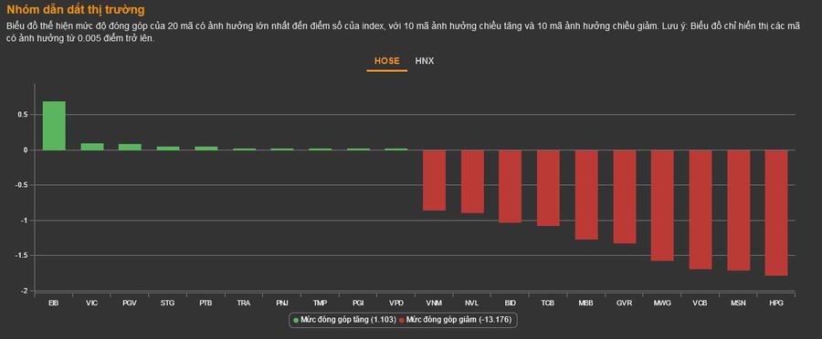 Ngoài EIB, các mã nằm trong top 10 đóng góp điểm cho VN-Index còn có VIC, PGV, STG, PTB, TRA, PNJ, TMP, PGI, VPD nhưng mức tăng chỉ dưới 0,01 điểm.
