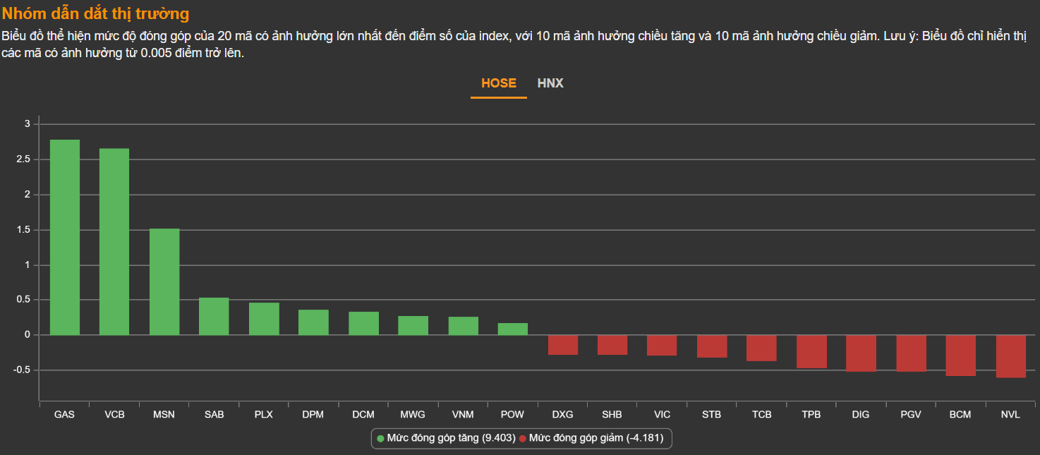 VCB và GAS là hai công thần của VN-Index sáng nay khi lần lượt đóng góp tới 2,5 và 2,39 điểm.