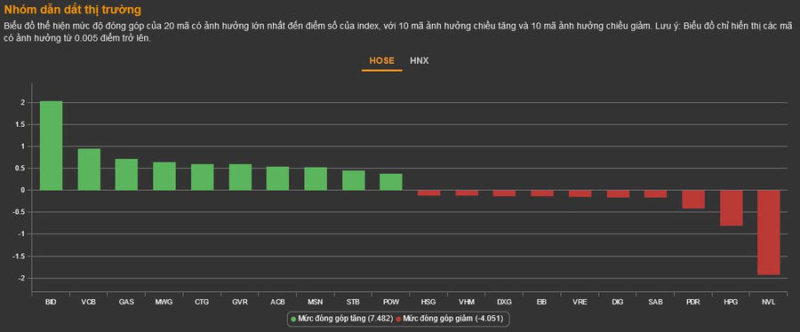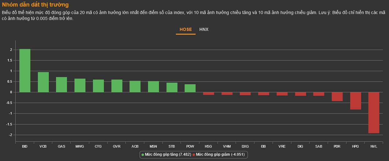 Rổ VN30 có tới 23 mã tăng điểm, ngoài nhóm ngân hàng thì các mã đóng góp điểm nhiều nhất cho VN-Index là GAS (+0,7 điểm), MWG (+0,65 điểm), GVR (+0,62 điểm), MSN (+0,53 điểm), POW (+0,40 điểm).