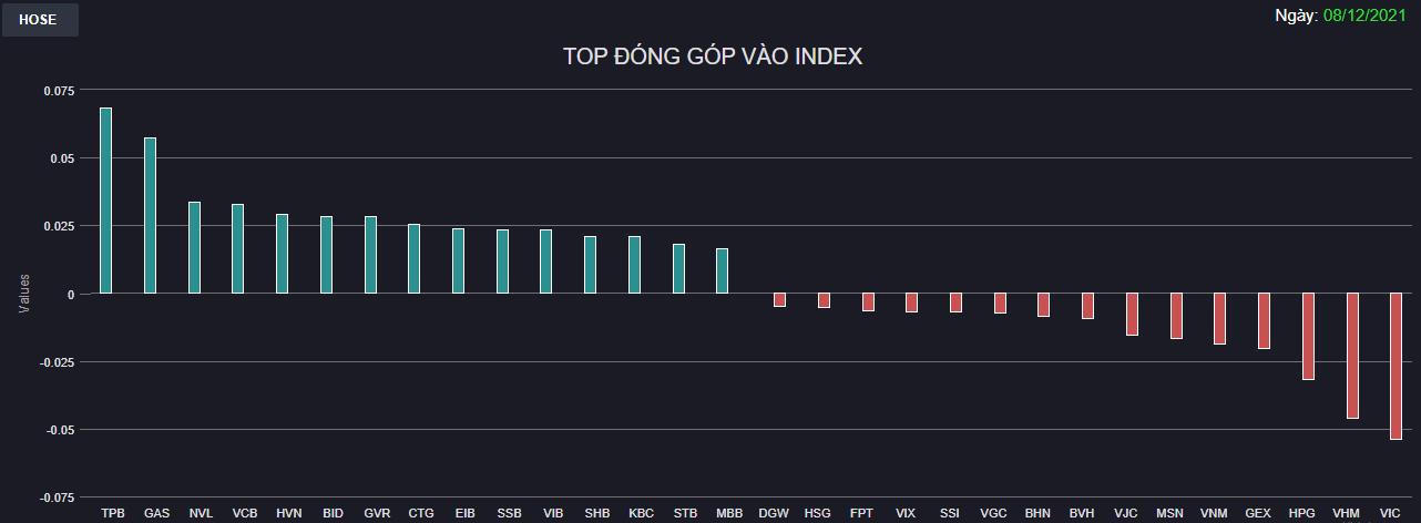 Nhóm Dầu khí với GAS đại diện trong top kéo điểm. Hiệu ứng lan tỏa khá tốt giúp BSR, PLX, PVD, PVS, PVC đều tăng khá mạnh. Nhóm Bất động sản cũng có nhiều cái tên khởi sắc như NVL, GVR, KBC, DPG, DIG, KDH,...