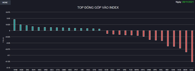 Áp lực chốt lời gia tăng đáng kể vùng đỉnh là điều không thể tránh khỏi và thị trường cũng cần nhịp điều chỉnh cần thiết trước khi nghĩ đến những mốc cao hơn. Các Bluechips như GAS, MSN, VCB, SHB, BID, NVL, VPB, VNM, HPG, MWG,... đều chìm trong sắc đỏ khiến VN-Index quay đầu giảm điểm.