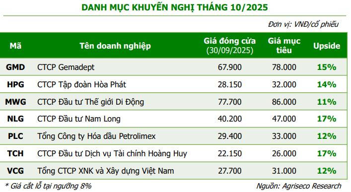 Trên cơ sở đó, Agriseco Research lựa chọn danh mục khuyến nghị tháng 10 với 7 cổ phiếu có nền tảng cơ bản tốt, dự kiến ghi nhận kết quả kinh doanh quý III/2025 tích cực và hưởng lợi từ chính sách hỗ trợ kinh tế của Chính phủ.