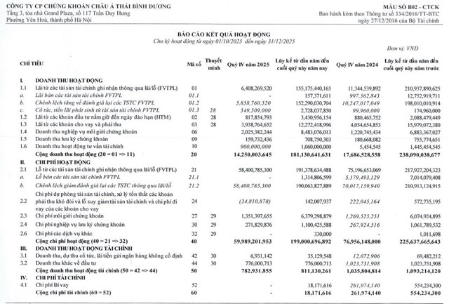 Về bức tranh tài chính, trong quý IV/2025, APS ghi nhận tổng doanh thu hoạt động đạt 14,2 tỷ đồng, giảm 19% so với cùng kỳ năm ngoái. Trong đó, phần lớn là lãi từ việc đánh giá lại tài sản tài chính đạt 6,4 tỷ đồng, giảm 43,5% so với cùng kỳ năm ngoái.