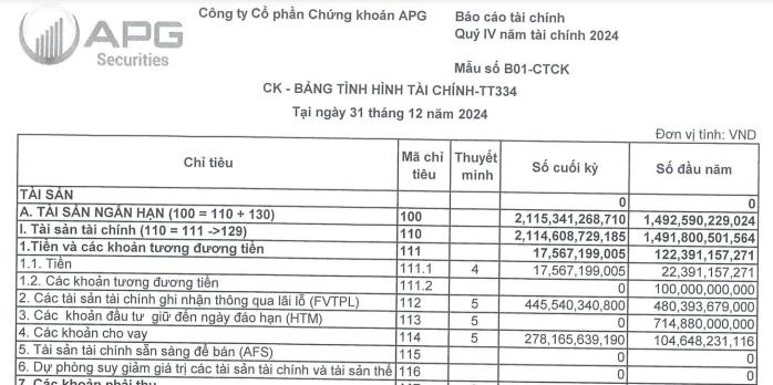 Tính đến cuối năm 2024, tổng tài sản của APG đạt 2.653 tỷ đồng, tăng 45% so với đầu năm. Ngoài việc tăng mạnh, cơ cấu tài sản cũng ghi nhận nhiều chuyển biến lớn.