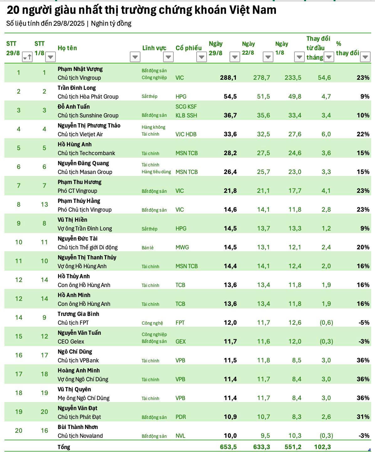 Tính đến ngày 29/8/2025, tổng giá trị tài sản quy đổi theo thị giá cổ phiếu của 20 người giàu nhất thị trường chứng khoán Việt Nam đạt 653.500 tỷ đồng, tăng 102.300 tỷ đồng so với đầu tháng 8.