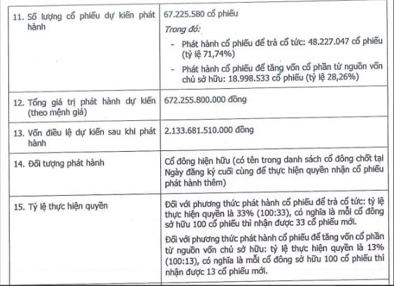 Đồng thời, Công ty phát hành gần 19 triệu cổ phiếu để tăng vốn cổ phần từ nguồn vốn chủ sở hữu, tương ứng tỷ lệ 100:13, tức là cổ đông sở hữu 100 cổ phiếu được nhận 13 cổ phiếu mới. Nguồn vốn sử dụng cho việc phát hành bao gồm lợi nhuận sau thuế chưa phân phối và thặng dư vốn cổ phần, được xác định dựa trên báo cáo tài chính soát xét bán niên 2024.