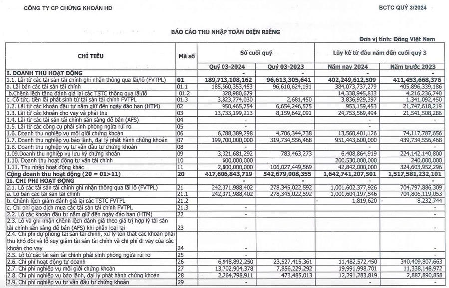 Về kết quả kinh doanh, 9 tháng đầu năm 2024, HDBS mang về gần 1.643 tỷ đồng doanh thu hoạt động, tăng 8% so với cùng kỳ năm trước. Đóng góp chủ đạo trong doanh thu hoạt động là doanh thu nghiệp vụ bảo lãnh và đại lý phát hành chứng khoán, lãi bán các tài sản tài chính, doanh thu tư vấn tài chính.