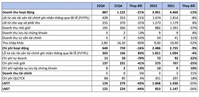 Trong đó, mảng môi giới đem về 195 tỷ đồng, sụt giảm mạnh 47%; lãi từ cho vay và phải thu mang lại 255 tỷ đồng, giảm 31% so với cùng kỳ năm 2021.