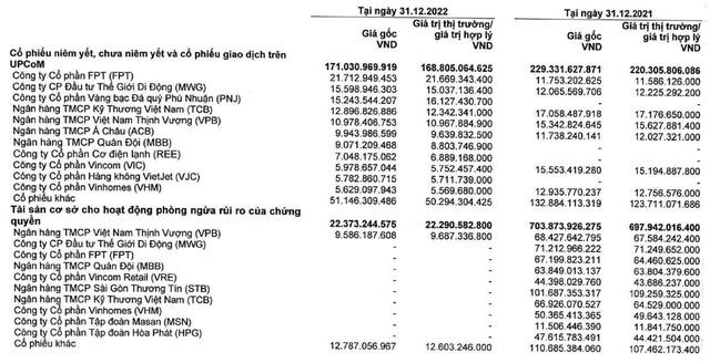 Danh mục cổ phiếu HSC nắm giữ hầu hết đều là bluechips trong rổ VN30 như FPT, MWG, PNJ, TCB, VPB, ACB, MBB, REE, VIC, VJC, VHM. Riêng trong quý 4, giá trị ghi sổ tài sản FVTPL là cổ phiếu của HSC giảm 789 tỷ đồng xuống còn hơn 171 tỷ đồng.
