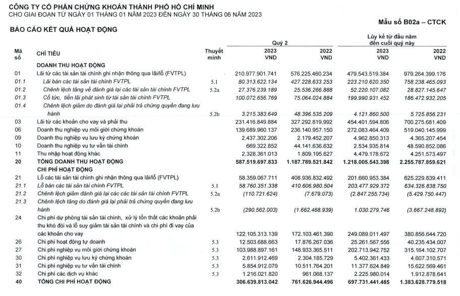 Về bức tranh tài chính, trong quý II/2023, HSC ghi nhận doanh thu hoạt động giảm gần 51% so với cùng kỳ, lùi về mức 587,5 tỷ đồng.
