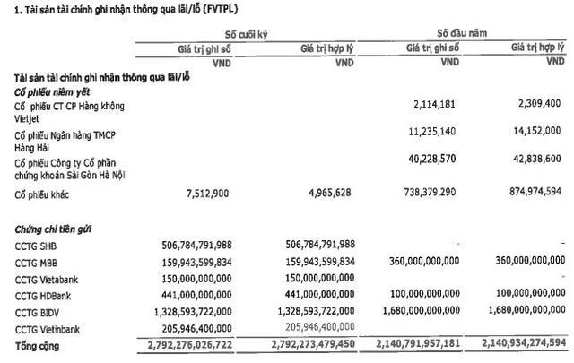 Bên cạnh đó, danh mục tự doanh FVTPL đạt 2.792 tỷ đồng, giảm 651 tỷ đồng so với đầu năm, chủ yếu là chứng chỉ tiền gửi. Công ty còn có hơn 1.266 tỷ đồng tiền gửi tại các ngân hàng với kỳ hạn từ 3 tháng đến 1 năm, tăng hơn 460 tỷ so với đầu năm.