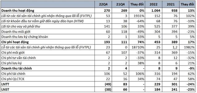 Nguồn thu từ hoạt động môi giới chứng khoán đạt 60 tỷ đồng, giảm 49%; lãi từ các tài sản tài chính ghi nhận thông qua lãi lỗ (FVTPL) tăng mạnh từ 3 tỷ trong quý 4/2021 lên 53 tỷ đồng trong kỳ báo cáo trong khi thu từ khoản đầu tư nắm giữ đến ngày đáo hạn giảm 64% xuống 13 tỷ đồng.